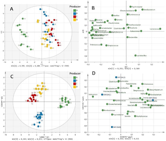 Finally, OPLS-DA, which yielded 3 + 2 + 0 components and with the parameters and , confirmed the differentiation among producers (Figure 4C). Producer A was clearly distinguished from the other producers, as observed before. However, producer B also showed a clear differentiation from producers C and D. The loadings plot (Figure 4D) revealed the characteristic genera in the cheeses of each producer, corroborating the results of the in-depth analysis of microbial shifts and the PCA.