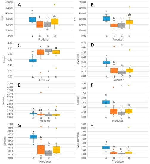 Box plot representation of bacterial alpha diversity indices ((A) Chao1; (B) ACE; (C) Berger; (D) Jevenness; (E) Eevenness; (F) Shannon; (G) Simpson; (H) Inverse Simpson) of Latxa ewe raw milk and Idiazabal cheese samples obtained from four producers (A, B, C and D). For each diversity index, different letters indicate significant differences between producers at p ≤ 0.05.