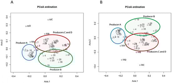 Subsequently, to clarify differences in the microbial composition of cheeses among producers, beta diversity was calculated. At genus level, cheese samples were distributed into three clusters corresponding to cheeses from producer A, producer B and producers C and D, which were very similar (Figure 6). Samples from producer A were tightly clustered, indicating less microbial changes during the ripening time compared with cheeses from other producers. Samples collected from producers A and B at 120 days of ripening grouped close to those collected from producers C and D at the same time point, indicating similar bacterial composition among cheese samples of different producers at the end of ripening. In addition, milk samples were far from the general dispersion of cheese samples, indicating clear differences in bacterial composition between the two sample types. To the best of our knowledge, very few studies have been published comparing beta diversity of the same raw ewe milk and cheese among different producers [37,39,40,44]. Endres et al. [40] have reported differences in raw ewe milk samples among different dairies, and Cardinali et al. [37] have reported differences among the producers of Queijo de Azeitão cheese. Beta diversity has also been used to differentiate among the different types of ewe cheeses [95] and to analyse the effect of specific starters on cheese microbiota [39].