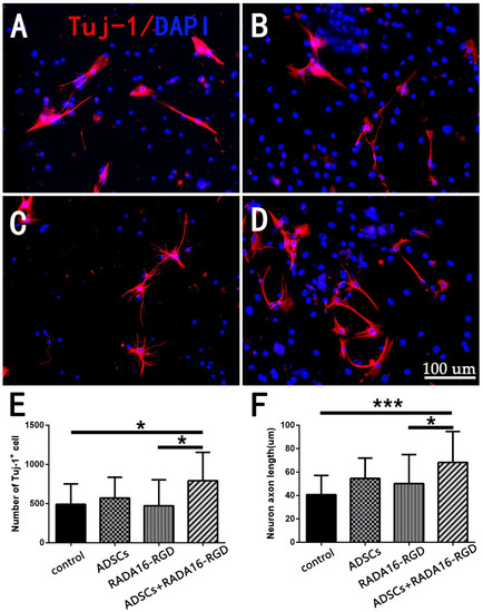 3.2. ADSCs+RADA16-RGD Increased the Neuron Numbers and Axon Lengths In Vitro