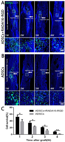 To assess the survival of the transplanted cells, we prepared the sections at 1–4 weeks and then performed anti-HUNA immunostaining. The spinal cord samples were collected at different time points after the transplantation of ADSCs-RADA16-RGD and ADSCs. Anti-HUNA immunostaining revealed that the ADSCs in the ADSCs-RADA16-RGD group were distributed around the injury site (Figure 2A), while those in the ADSCs group were partially migrated to the spinal cord surface (Figure 2B (1W,2W)). The results of the quantitative analysis suggested that the survival rate of ADSCs in the ADSCs-RADA16-RGD group was significantly greater than that in the ADSCs group (Figure 2C).