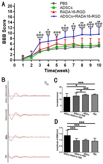 The Basso, Beattie, and Bresnahan (BBB) score was recorded on the second week of SCI. The rats with the difference in the left and right hind limb scores of ≥3 or an average score of both the hind limbs > 3 were excluded. The rats were randomly divided into PBS, ADSCs, RADA16-RGD, and ADSCs+RADA16-RGD groups.
