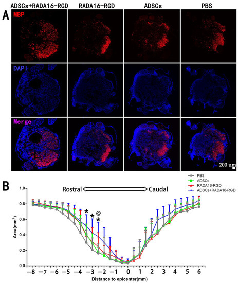 MBP is expressed exclusively in oligodendrocytes, and it plays a critical role in maintaining the structural integrity and functional stability of the medullary sheath. This protein is essential for promoting the remyelination of axons in rats after SCI. The results of myelin marker MBP staining signified that the areas of MBP+ at −2.5 mm, −3 mm, and −3.5 mm on the cephalic side of the injury center were significantly larger. The MBP+ area in the injury center was larger in the ADSCs+RADA16-RGD group than in the PBS, ADSCs, and RADA16-RGD groups, albeit without any significant difference. Furthermore, no significant difference was recorded in the caudal side of the injury among the three groups (Figure 5).