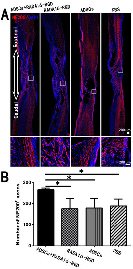ADSCs+RADA16-RGD transplantation increases the number of NF200+ nerve fibers at the injury center. (A) At 8 weeks of transplantation of ADSCs+RADA16-RGD, NF200 antibody staining (red) was performed via passing through the central sagittal section of the spinal cord injury. The panels below (A) show high magnification of boxed regions in the top panels. (B) Quantitative analysis of NF200+ nerve fibers at the injury center. The ADSCs+RADA16-RGD group was significantly higher than the PBS, ADSCs, and RADA16-RGD groups (ADSCs+RADA16-RGD vs. PBS, ADSCs, or RADA16-RGD: p < 0.05). * p < 0.05. Data are presented as mean ± SEM (n = 3 per group). Scale bar = 200 µm. ADSCs: adipose stem cells; NF200: neurofilament 200; DAPI: 4′6-diamidino-2-phenylindole. NF200 (red): Alexa Fluor 647.