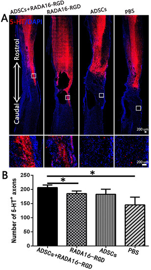 The number of 5-HT+ fibers in the injury center was significantly higher in the ADSCs+RADA16-RGD (Figure 7).