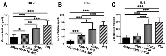 Acute inflammatory reaction after SCI results in neuronal death and axonal degeneration and atrophy, while chronic inflammation leads to neurodegeneration, glial scarring, and cavity formation. TNF-α, IL-1β, and IL-6 are highly expressed in the early stages of SCI and represent the inflammatory immune microenvironment. The expression levels of inflammatory cytokines, including TNF-α, IL-1β, and IL-6, were measured for 2 weeks and were significantly lower after the transplantation of ADSCs+RADA16-RGD (Figure 9).