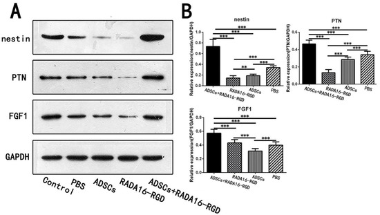 Expression of the selected proteins in week 2 as assessed by Western blotting. (A) Expression of nestin, FGF1, and PTN proteins in the second week by Western blotting. (B) Quantification of the relative protein expression. The expression of nestin in the ADSCs+RADA16-RGD group was significantly higher than that in the PBS, ADSCs, and RADA16-RGD groups (ADSCs+RADA16-RGD vs. PBS or ADSCs or RADA16-RGD: p < 0.001), while it was significantly lower in the RADA16-RGD group than in the ADSCs and PBS groups (RADA16-RGD vs. ADSCs: p < 0.01, RADA16-RGD vs. PBS: p < 0.001), and significantly lower in the ADSCs group compared to the PBS group (ADSCs vs. PBS: p < 0.001). The expression of PTN was significantly higher in the ADSCs+RADA16-RGD group than in the PBS, ADSCs, and RADA16-RGD groups (ADSCs+RADA16-RGD vs. PBS or ADSCs or RADA16-RGD: p < 0.001), significantly lower in the RADA16-RGD group than in the ADSCs and PBS groups (RADA16-RGD vs. ADSCs or PBS: p < 0.001), and significantly lower in the ADSCs group than in in the PBS group (ADSCs vs. PBS: p < 0.001). The expression of FGF1 was significantly higher in the ADSCs+RADA16-RGD group than that in the PBS, ADSCs, and RADA16-RGD groups (ADSCs+RADA16-RGD vs. PBS or ADSCs or RADA16-RGD: p < 0.001), and significantly lower in the ADSCs group than that in the RADA16-RGD and PBS groups (ADSCs vs. PBS or RADA16-RGD: p < 0.001). ** p < 0.01, *** p < 0.001. Data are presented as mean ± SEM (n = 3 per group). ADSCs: adipose stem cells; FGF1: fibroblast growth factor 1; PTN: pleiotrophin; GAPDH: glyceraldehyde-3phosphate dehydrogenase.