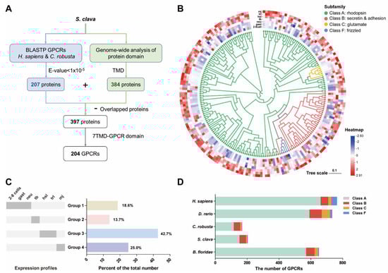 A flowchart of the GPCR protein identification process was followed to obtain the repertoire of S. clave GPCRs (Figure 1A). We first collected the protein sequences of GPCRs from H. sapiens and C. robusta and ran BLASTP to search for putative S. clava GPCRs, which yielded 207 protein sequences. Meanwhile, we conducted a genome-wide domain analysis in S. clava to identify proteins with TMDs and obtained 384 protein sequences. The dataset of 397 protein sequences was obtained based on the above two methods. In this dataset, the sequences with seven transmembrane-GPCR domains (7TM-GPCR domains) (199 sequences in total) were considered to be putative S. clava GPCR sequences. We manually inspected all the sequences identified in the above searches, split those containing repetitive 7TM-GPCR domains, and eventually obtained 204 putative GPCRs, which represented ~1.1% of the total number of gene transcripts predicted from the S. clava genome [12]. These putative proteins were further confirmed by phylogenetic analysis (Figure 1B). The S. clava GPCRs exhibited dynamic expression patterns during embryonic and larval development (Figure 1B). The S. clava GPCRs could be classified into four groups according to the expression profiles during development (Figure 1C): the GPCRs in Group 1 (~18% of the total number) were highly expressed in the early embryonic stages; in Group 2 (~14% of the total number), receptors showed the highest expression levels in the tailbud stage; around 68% of S. clava GPCRs belonged to Group 3 (highest expression in the swimming larvae) and Group 4 (highest expression in the metamorphic larvae/ juveniles).