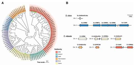Phylogenetic tree and chromosomal locations of S. clava Class C GPCRs. (A) Phylogenetic tree of Class C GPCRs was constructed using the Neighbor-Joining method. Green dots indicate S. clava Class C GPCRs. Different subtypes of receptors are shaded in different colors. The species abbreviations: Hs, H. sapiens; Mm, M. musculus; Dr, D. rerio; Pm, P. marinus; Cr, C. robusta; Sc, S. clava. The NCBI accession numbers for sequences used in the phylogenetic analysis can be found in Table S4. (B) Chromosomal locations of S. clava and C. robusta Class C GPCRs are shown in colored arrows. The direction of arrow indicates forward strand (right) and reverse strand (left). The scale bar represents a length of 10 Kb (the information for other species can be found in Table S3).
