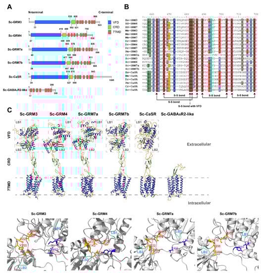 Functional domain and tertiary structure prediction of S. clava Class C GPCRs. (A) The functional domains are indicated by blue (VFD), green (CRD), and red (7TMD) boxes. (B) Sequence alignment of CRDs for representative GRMs and CaSRs in different species. The conserved residues are shaded. The highly conserved cysteines are indicated by black triangles. The putative disulfide bridges formed within CRD and with VFD [39] are marked out below the alignment using solid and dashed lines, respectively. (C) The tertiary structures were predicted based on homology modeling in the Swiss Model and visualized in the Ribbon diagram, in which the α-helices, β-sheets, and random coils are shown in blue, green, and orange, respectively. The VFD of each receptor contains lobe 1 (LB1) and lobe 2 (LB2). In the VFD of each Sc-GRM, the putative ligand-binding pocket is shown in detail. Five of seven residues important for L-glutamate binding are conserved in Sc-GRMs: conserved residues in orange and non-conserved resides in blue.