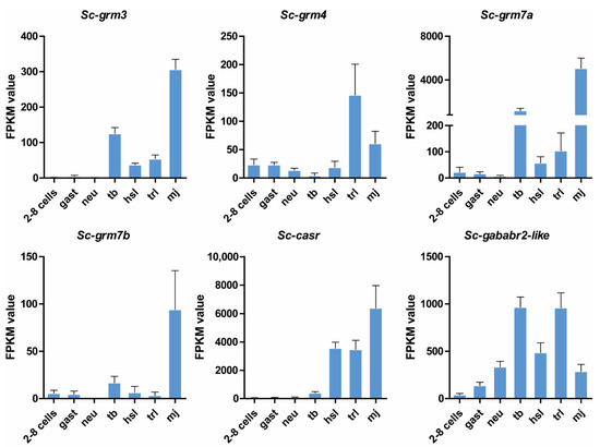 To understand the potential roles of Class C GPCRs during embryonic and larval development, we plotted individually the expression patterns of these receptors based on our transcriptome data [12] (Figure 4). The Sc-grm3 and Sc-grm7a had consistent expression patterns: highly expressed at both tb and mj stages but maintained at relatively low expression levels at other stages. The Sc-grm4 had the highest expression at the trl stage, while the Sc-grm7b was highly expressed at the mj stage. The transcripts of Sc-casr were shown to retain low expression levels from two to eight cells to the tb stage but dramatically increased from the hsl to mj stage. However, the transcripts of Sc-gababr2-like exhibited a more dynamic expression pattern. Its expression was gradually increased and reached the highest levels at the tb stage, then dramatically decreased and increased again at the trl stage, and finally decreased at the mj stage. The dynamic expression patterns of these receptors indicated their importance during embryonic and larval development.