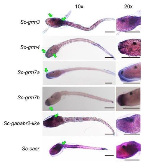 Whole-mount in situ hybridization of genes encoding S. clava Class C GPCRs in swimming larvae. Hybridized signals are distributed in the larval trunks and indicated by green arrowheads. The left and right panels indicate the same swimming larva for each gene observed under a microscope at 10× and 20× magnification, respectively. Scale bar: 100 μM. Negative controls with sense probe can be found in Figure S2.