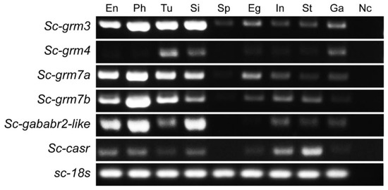 Tissue distribution of S. clava Class C GPCR transcripts by RT-PCR. The transcripts of six Class C GPCRs were detected in the tissues of S. clava adults. The tissue abbreviations: En, endostyle; Ph, pharynx; Tu, tunic; Si, siphon; Sp, sperm; Eg, eggs; In, intestine; St, stomach; Ga, cerebral ganglion. Nc stands for negative control (no cDNA template in reaction). S. clava 18s rRNA (Sc-18s) was used as the reference gene.
