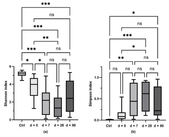 - Holler, E.; Butzhammer, P.; Schmid, K.; Hundsrucker, C.; Koestler, J.; Peter, K.; Zhu, W.; Sporrer, D.; Hehlgans, T.; Kreutz, M.; et al. Metagenomic analysis of the stool microbiome in patients receiving allogeneic stem cell transplantation: Loss of diversity is associated with use of systemic antibiotics and more pronounced in gastrointestinal graft-versus-host disease. Biol. Blood Marrow Transplant. 2014, 20, 640–645. [Google Scholar] [CrossRef] [PubMed]