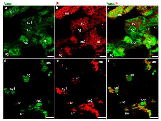 Figure 2. Identification of testicular cells by fluorescent immunostaining. Fluorescent immunostaining on testis sections and isolated testicular cells of adult American shad (2Y+). (ac), sections. (df), Testicular cells. Green fluorescence is for Vasa protein (a,c) and red fluorescence is the nuclear staining with propidium iodide (PI) (b,e); (c) and (f) are the merged images. sg, spermatogonia. sc, spermatocytes. st, spermatids. sm, spermatozoa and somatic cells indicated with asterisks. Scale bars, 20 µm.