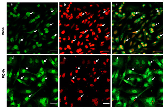 Figure 4. Expression of Vasa and PCNA in the cultured cells. Fluorescent immunostaining analysis of the cultured cells at 6th passage (cultured over 30 days); the cells were stained with polyclonal anti-Vasa antibody (green in a), and Monoclonal anti-PCNA antibody (green in d). Nuclei were stained with PI (red in b,e). Merged images (c,f). The arrows indicate the cells expressing both Vasa and PCNA. Scale bars, 20 µm.