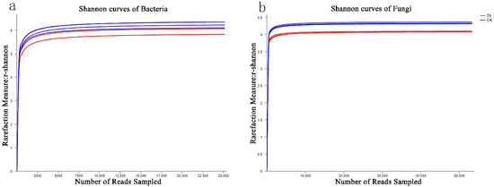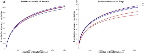We filtered the sequencing data to exclude low-quality and short reads, yielding 52,807 and 50,480 bacterial 16S rDNA and 76,609 and 68,753 fungal ITS sequences in the T6-1 and CK groups, respectively. With a clustering dissimilarity cut-off of 3%, the reads were classified into diverse OTUs. The 0.03 distance level rarefaction curves of the bacterial as well as fungal communities did not reach an asymptote (Figure 1). Hence, the sequencing data did not fully represent all of the communities present in the samples. However, by integrating the Shannon diversity index with the rarefaction curves (Figure 2), we established that, with an increasing number of reads, the Shannon diversity curves approached a plateau. Hence, adequate data were obtained to facilitate the examination of the communities.
