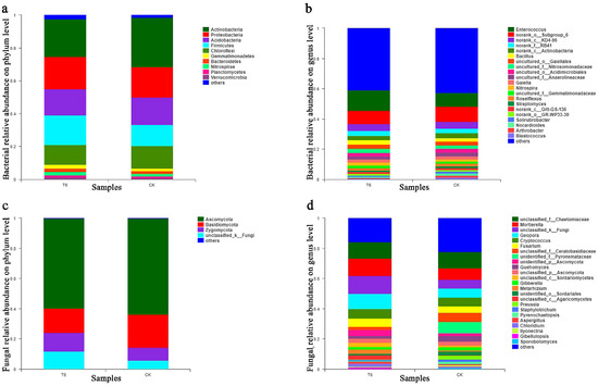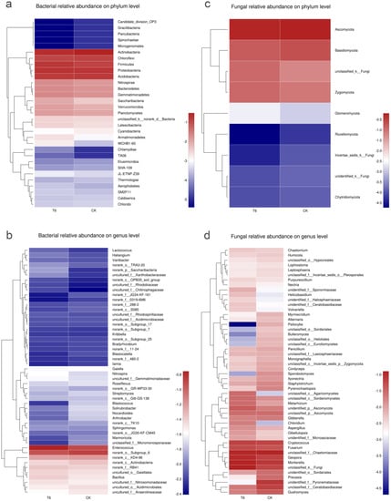 The Mothur program was employed to classify the sequences. The dominant bacterial phyla were Actinobacteria (22.90% and 30.21% in T6-1 and CK groups, respectively), Proteobacteria (19.64% and 18.29% in T6-1 and CK groups, respectively), and Acidobacteria (16.04% and 16.70% in the T6-1 and CK groups, respectively). The dominant fungal phyla were Ascomycota (59.41% and 63.76% in the T6-1 and CK groups, respectively) and Basidiomycota (16.28% and 21.78% in the T6-1 and CK groups, respectively) (Figure 3). Heatmap-based analysis of the community structure confirmed that Actinobacteria, Proteobacteria, as well as Acidobacteria were the predominant bacterial phyla. On the other hand, Ascomycota, along with Basidiomycota, were the predominant fungal phyla (Figure 4a,c).