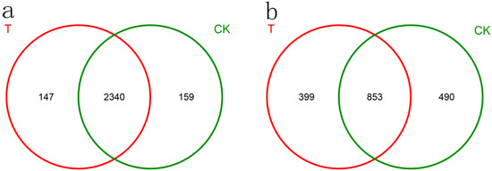 Venn diagram exhibiting unique, as well as shared (a) bacterial OTUs (b) fungal OTUs for the two treatments. The T6-1 group included poplar trees, which were exposed to bacterial zymotic fluid with T6-1. The CK group consisted of poplar trees, which were exposed to an equivalent volume of sterile zymotic fluid. We analyzed three replicates for every treatment.