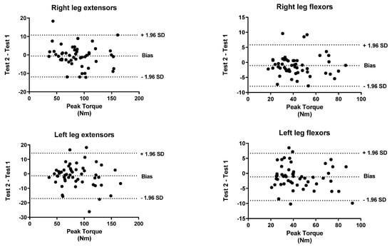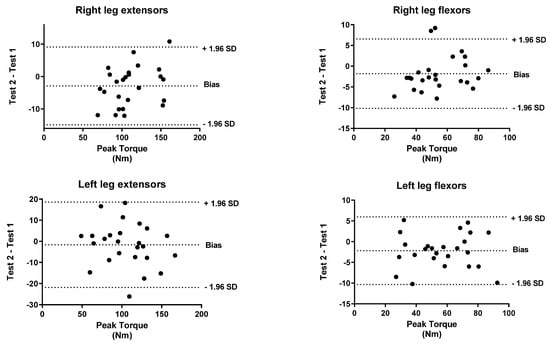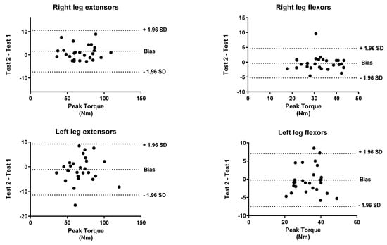 Men Bland–Altman peak torque analysis for Right and Left Legs in flexion and Extension.