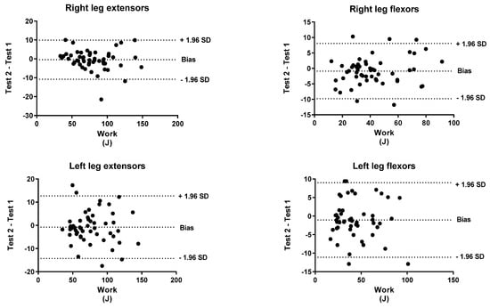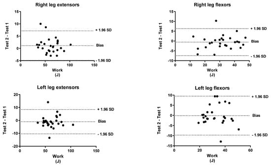 Men Bland–Altman work analysis for Right and Left Legs in flexion and Extension.