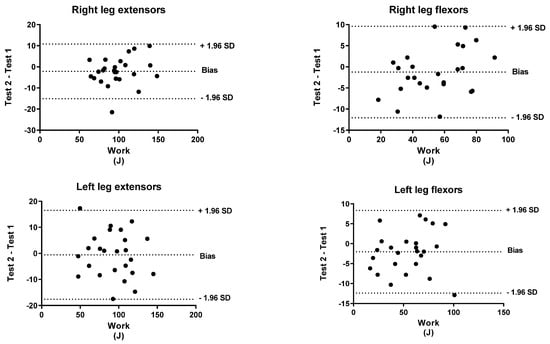 To identify the level of agreement between the test and retest, a Bland–Altman analysis was performed for both peak torque and work. The x-axis indicates the mean of the test and the y-axis indicates the difference between the two measurements (retest-test).