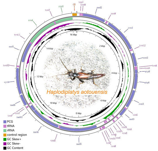 Consensus mitogenome structure of Haplodiplatys aotouensis. The map is generated based on Fujian’s sample. Genes outside the map are transcribed clockwise, while those inside the map are transcribed counterclockwise. Names and other details of the genes are listed in Table 2. The inside circles show the GC content and the GC skew. GC content and GC skew are plotted as the deviation from the average value of the entire sequence.