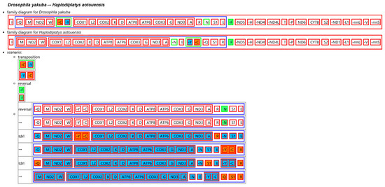Reconstruction of mitochondrial gene rearrangement scenarios in the evolution of Haplodiplatys aotouensis. The ancestral mitochondrial gene arrangement of Drosophila yakuba is set as the reference. The tRNA genes are represented by the amino acid abbreviations. In each rearrangement event of the scenario, the upper box indicates the earlier arrangement of related genes, whereas the lower box indicates the rearranged gene order after the event.