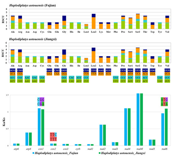 Relative synonymous codon usage (RSCU) and evolutionary rates of PCGs in Haplodiplatys aotouensis. In the Ka/Ks chart, t1he different codons between Fujian’s (upper) and Jiangxi’s (lower) samples are marked above the relevant PCGs.