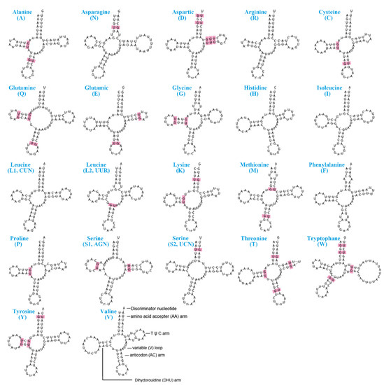 - Garey, J.R.; Wolstenholme, D.R. Platyhelminth mitochondrial DNA: Evidence for early evolutionary origin of a tRNAserAGN that contains a dihydrouridine arm replacement loop, and of serine-specifying AGA and AGG codons. J. Mol. Evol. 1989, 28, 374–387. [Google Scholar] [CrossRef]