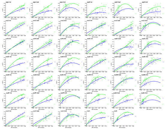 Substitution saturation plots per codon position for PCGs and per gene for rRNA. The plots of cox1 were calculated excluding the partial cox1 sequence of Diplatys flavicollis.