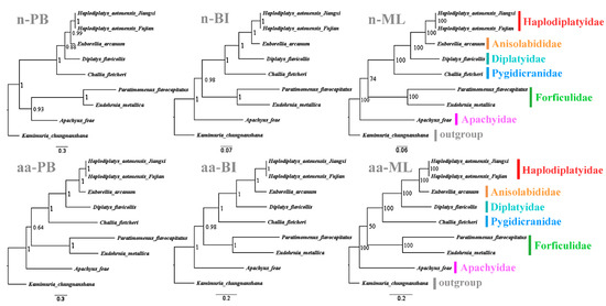 Phylogenetic relationships within Dermaptera inferred from mitogenomic data. Numbers at the nodes are posterior probabilities or bootstrap values. The family names are listed after the species. Abbreviations: n-PB, Phylo–Bayesian tree based on nucleotide dataset; n-BI, Bayesian tree based on nucleotide dataset; n-ML, maximum likelihood tree based on nucleotide dataset; aa-PB, Phylo–Bayesian tree based on amino acid dataset; aa-BI, Bayesian tree based on amino acid dataset; aa-ML, maximum likelihood tree based on amino acid dataset.