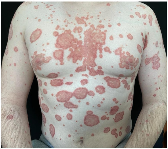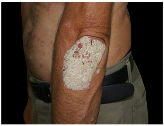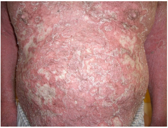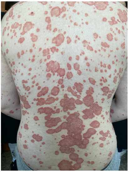 Psoriasis is a chronic multisystem inflammatory disease marked by a strong genetic predisposition, as well as autoimmune pathogenic features [1]. Although it may vary between different regions, the worldwide prevalence of psoriasis is considered to be 2% [1]. It affects both men and women equally [1]. The hallmark of psoriasis is the excessive proliferation and altered differentiation of keratinocytes, which results in the typical clinical appearance of the lesions: well-demarcated erythematous plaques of variable size with silvery scale predominantly on the elbows, knees, lumbar region, and scalp (Figure 1), with the possibility of extensive involvement of the skin (Figure 2 and Figure 3) [2]. The most common morphologic variant of psoriasis is chronic plaque psoriasis, which accounts for up to 80% of cases; however, more severe clinical presentations, such as the erythrodermic variant, may be seen as well (Figure 4) [3]. Psoriasis not only affects the skin, but also the nails and joints [4]. At the present moment, it is well-recognized that psoriasis is associated with a plethora of comorbidities including metabolic syndrome, cardiovascular disease, hypertension, diabetes, hyperlipidemia, obesity, anxiety, depression, chronic kidney disease, and malignancy [4,5].