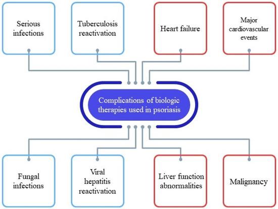 Psoriasis is a chronic systemic inflammatory disease associated with numerous comorbidities ranging from metabolic syndrome and cardiopathy to psoriatic arthritis and psychological disorders [4,5,75]. Apart from the concomitant diseases psoriasis patients may suffer from, biologic therapy may cause significant complications; therefore, finding the right biologic agent for each patient may prove challenging [43,44,45,46,48,50,51,52,54,55,56,57,64,65,72]. It seems that a promising tool for establishing which biologic agent is most suitable for each patient is represented by pharmacogenomics. In the future, particular biomarkers may be tested for each case in order to identify which biologic agent will likely be effective and which will cause complications [36,37]. Nevertheless, at the present moment, the key step for the proper management of psoriasis patients under biologic therapy includes the close collaboration between dermatologists and colleagues of other specialties [75,76,77,78,79]. For that reason, it was our main purpose to provide an overview on each class of biologic agents, as well as on the most frequent adverse events they may cause in psoriasis patients with concomitant diseases.