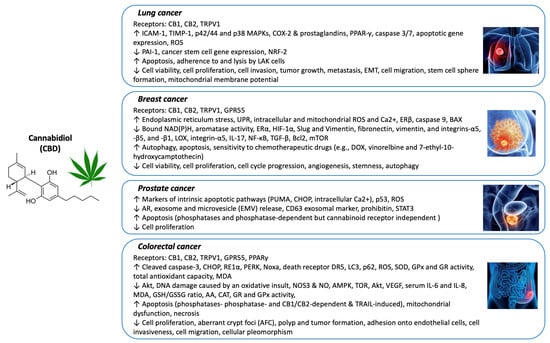 Although the efficacy of CBD or co-treatment with CBD and other cannabinoids in alleviating cancer pain and the side effects associated with chemotherapy were assessed in clinical trials, preclinical models were mostly used to evaluate the direct anticancer effects of CBD. This review focuses on the summary of studies published in recent years on the efficacy and mechanisms of action of CBD against four cancers: lung, breast, prostate, and colorectal cancer (Table 1). These four types of cancer were selected because they are the most common causes of cancer cases and deaths in the United States [19], as well as globally [25].