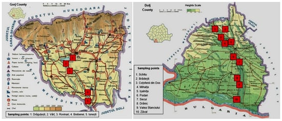 The geographical distribution of the soil unit from the studied Dolj and Gorj counties it is shown in Figure 1, and Supplementary Table S1 it shows the location of soil samplings points and the main parameters of: pH, atmospheric pressure (hPa), relative humidity (%), and humidity at the sampling moment.