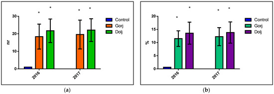 The statistical analysis of the results of the worm counts, compared with the Control. The (a) image represent the number of dead earthworms, and (b) image represent the percentage of dead earthworms, where * means, p < 0.05).