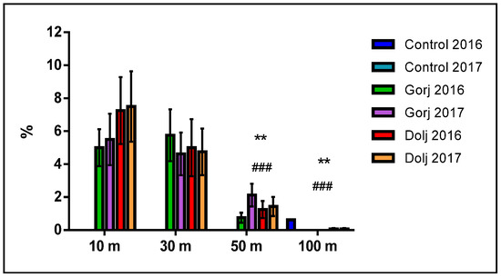 Regarding the distances from where the samples were gathered, the highest mortality also statistically confirmed appeared from 30 m (p < 0.001), and 10 m (p < 0.01). At the 50 m from the Jiu axis, the mortality dropped significantly: in Gorj between 0 and 9/5.625%, and, respectively, 0 and 8/5.0% dead earthworms in Dolj County. Only in one case, mortality at 100 m it was recorded (1/0.625%).
