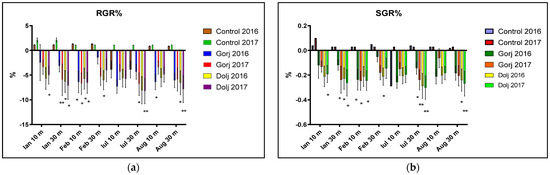 Statistical analysis of the Relative Growth Rate (RGR) (a) and the Specific Growth Rate (SGR) (b) per years/replicas/county, compared with Control unpolluted soils, which confirms the potential polluting effect of soils gathered at 10 and 30 m from the Jiu River’s axis. (Where *, means p < 0.05, and **, means p < 0.01).