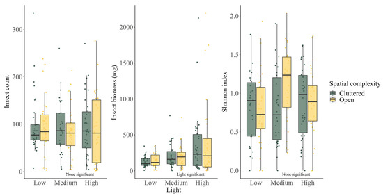 Boxplots (25th, 50th, 75th percentiles) and raw data points of insect count, Shannon diversity index, insect biomass at sites of varying ALAN levels, and spatial complexity. Independent variable significance is annotated in the graph.