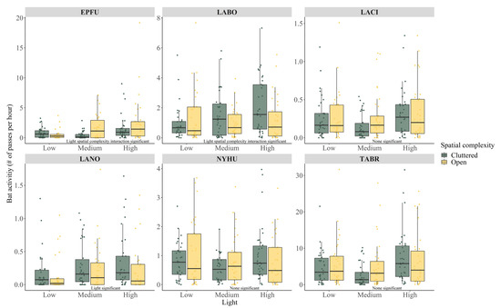 Boxplots (25th, 50th, 75th percentiles) and raw data point of species-specific bat activity at sites of varying ALAN levels and spatial complexity. Independent variable significance is annotated in the graph. Species abbreviations: big brown bat (Eptesicus fuscus, EPFU), eastern red bat (Lasiurus borealis, LABO), hoary bat (Lasiurus cinereus, LACI), silver-haired bat (Lasionycteris noctivagans, LANO), cave myotis (Myotis velifer, MYVE), evening bat (Nycticeius humeralis, NYHU), tricolored bat (Perimyotis subflavus, PESU) and Mexican free-tailed bat (Tadarida brasiliensis, TABR). Independent variable significance is annotated in the graph.