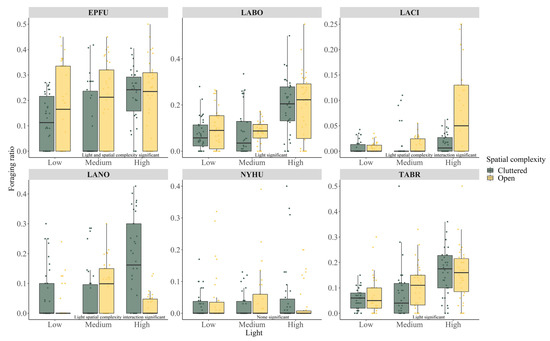 Boxplots (25th, 50th, 75th percentiles) and raw data points of species-specific foraging ratio at sites of varying ALAN levels and spatial complexity. Independent variable significance is annotated in the graph. Species abbreviations: big brown bat (Eptesicus fuscus, EPFU), eastern red bat (Lasiurus borealis, LABO), hoary bat (Lasiurus cinereus, LACI), silver-haired bat (Lasionycteris noctivagans, LANO), cave myotis (Myotis velifer, MYVE), evening bat (Nycticeius humeralis, NYHU), tricolored bat (Perimyotis subflavus, PESU), and Mexican free-tailed bat (Tadarida brasiliensis, TABR). Independent variable significance is annotated in the graph.