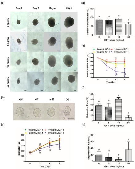 Effects of IGF-1 on mouse follicle growth and oocyte maturation. (a) Images of follicular growth in media containing different concentrations of IGF-1 (0, 5, 10, and 50 ng/mL) from day 0 to day 6; (b) Images of GV, MI, MII, and DG (degeneration) oocytes after IVM; (c) Line graph of change in follicle diameters in media containing different concentrations of IGF-1 from day 0 to day 6; (d) Follicle survival rates at day 6 in media containing different concentrations of IGF-1; (e) Line graph of change in follicle survival rates in media containing different concentrations of IGF-1 from day 0 to day 6; The maturation (f) and degeneration (g) rates of oocytes after IVM were isolated from follicles treated with different concentrations IGF-1 for 6 days. Scale bar in (a): 100 μm; (b): 50 μm. Error bar: standard deviation; points or bars with completely different letters (a, b, c) indicating significant difference among treatments for isolated time points (p < 0.05). n = 10 follicles for five replicates.