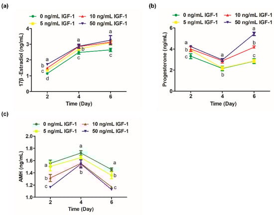 Effect of IGF-1 on hormone secretion of in vitro cultured follicles. (a) The secretion of 17β-estradiol; (b) progesterone and (c) AMH at days 2, 4, and 6. Error bar: standard deviation; points with completely different letters (a, b, c) indicating significant difference among treatments for isolated time points (p < 0.05). n = 10 follicles for three replicates.