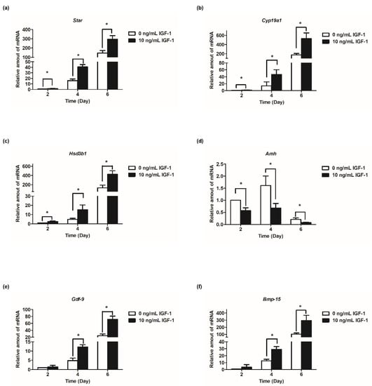 Considering follicular development, oocyte maturation efficiency and hormone secretion level, the optimal concentration of IGF-1 in the 3D culture of mouse follicles was 10 ng/mL. With the proliferation of GCs, the steroid secretion activity in follicles increased during the culture period. IGF-1 significantly promoted the expression of the steroidogenesis-related genes (Star, Cyp19a1, and Hsd3b1) at each stage. These results indicated that the synthesis increased steroid hormones by upregulating the expression of genes involved in steroid synthesis. The expression of Star, Hsd3b1, and Cyp19a1 in GCs is regulated by FSH stimulation, while IGF-1 alone can increase the expression of Star, Hsd3b1, and Cyp19a1 [39]. The intracellular pathway triggered by FSH and IGF-1 was mediated by different receptors and then promoted GCs to produce 17β-estradiol and progesterone. During the development of mouse follicles in vitro, the expression level of Amh increased in the early stage of culture and decreased in the late stage of culture. In research on rhesus macaques, the trend of Amh was similar to our result [40]. The addition of 10 ng/mL IGF-1 significantly down-regulated its mRNA expression level which inhibited the secretion of AMH. As a result, it attenuated the inhibition of follicle development.