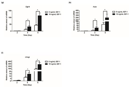 Effect of IGF-1 on the mRNA expression of hormone secretion related genes, oocyte-secreted factors and gonadotropin receptors in vitro. (a) The mRNA expression of Star; (b) The mRNA expression of Cyp19a1; (c) The mRNA expression of Hsd3b1; (d) The mRNA expression of Amh; (e) The mRNA expression of Gdf-9; (f) The mRNA expression of Bmp-15; (g) The mRNA expression of Fgf-8; (h) The mRNA expression of Fshr; and (i) The mRNA expression of Lhcgr. * p < 0.05 compared to the control group; error bar: standard deviation. n = 10 follicles for each of three replicates.
