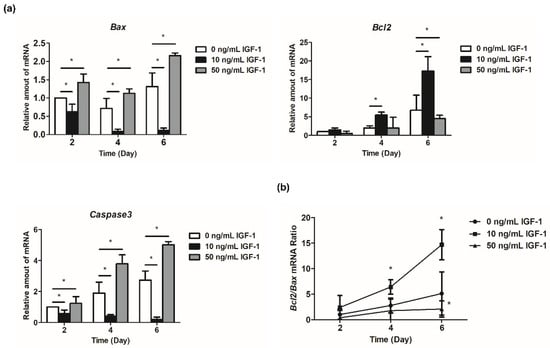 Effect of IGF-1 on apoptosis-related gene expression in vitro. (a) The relative expression level of Bcl2, Bax, and Caspase3; (b) The Bcl2/Bax mRNA ratio. * p < 0.05 compared to control group; error bar: standard deviation. n = 10 follicles for three replicates.