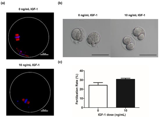 Spindle formation and chromosome alignment are important for the competence of oocytes. Accordingly, we evaluated the effect of adding IGF-1 on these parameters during in vitro culture. The results showed that the oocytes obtained from the G0 and G10 groups were able to form normal spindle and maintain normal chromosome distribution after in vitro maturation (Figure 6a). Meanwhile, there was no significant difference in the fertilization rate of G10 compared with G0 (12/39 vs. 9/37, p > 0.05) (Figure 6c). The oocytes in both G0 and G10 can develop to the two-cell stage after in vitro fertilization (Figure 6b).