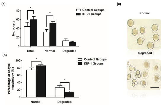 Ovulated oocytes in vivo in mice treated with IGF-1 (n = 30) or saline control (n = 30). (a) The in vivo number of ovulation oocytes, normal oocytes, and degraded oocytes of mice in IGF-1 treated group or control group; (b) Rates of normal oocytes and degraded oocytes of mice in vivo in the IGF-1 treated group or control group; and (c) The morphology of normal oocytes and degraded oocytes. Scale bar: 100 μm. * p < 0.05 compared to control group.