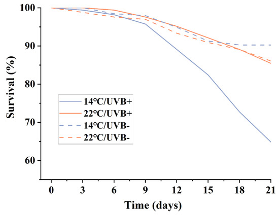Effect of UVBR (solid lines) and UVBR–free (dashed lines) environments in combination with either a 14 (blue lines) or 22 °C (red lines) temperature on the survival of Rana kukunoris tadpoles. Lines show the trend in mortality for each treatment over the 21 day exposure period. The survival of tadpoles in the 14 °C/UVBR group was only 65%, which was lower than that in the other three groups.